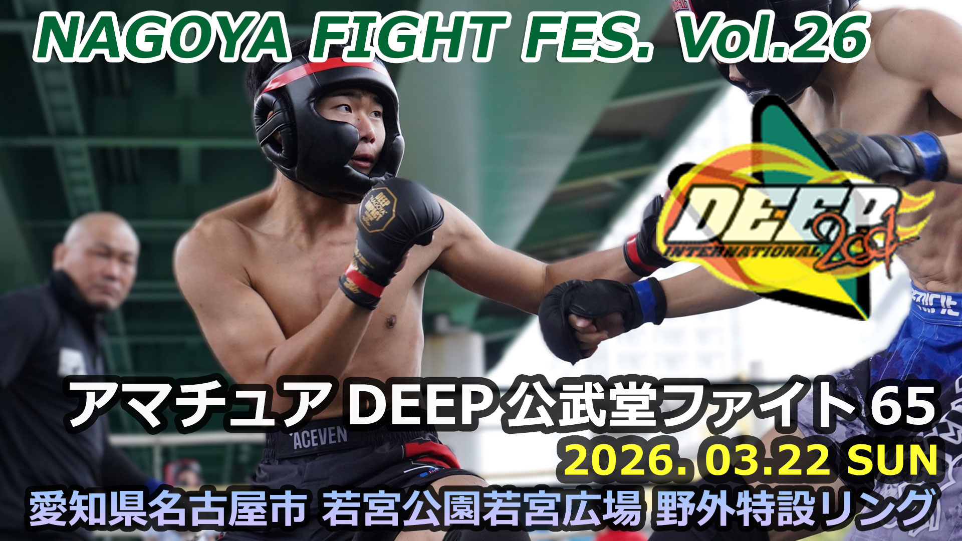 3月22日(日)、名古屋市中区・若宮広場野外特設リングにて「名古屋ファイトフェスvol.26『アマチュアDEEP公武堂ファイト65』」を開催いたします。